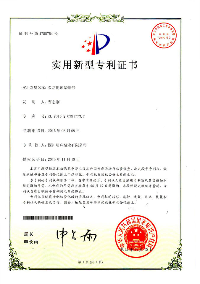《多功能鎖緊螺母》實(shí)用新型專利證書