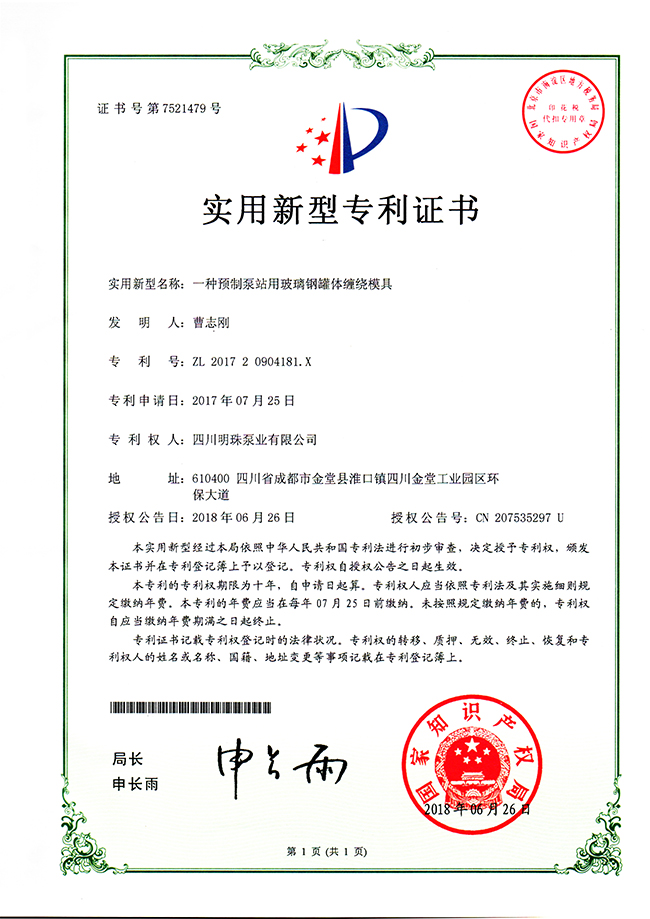 《一種預(yù)制泵站用玻璃鋼罐體纏繞模具》實(shí)用新型專利證書