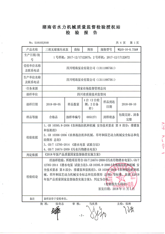 WQ三相無(wú)堵塞污水泵省質(zhì)量監(jiān)督檢驗(yàn)報(bào)告