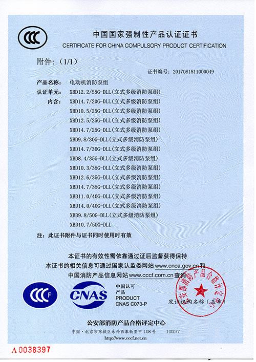 恭賀我司新增DLL立式多級消防泵組系列CCCF證書